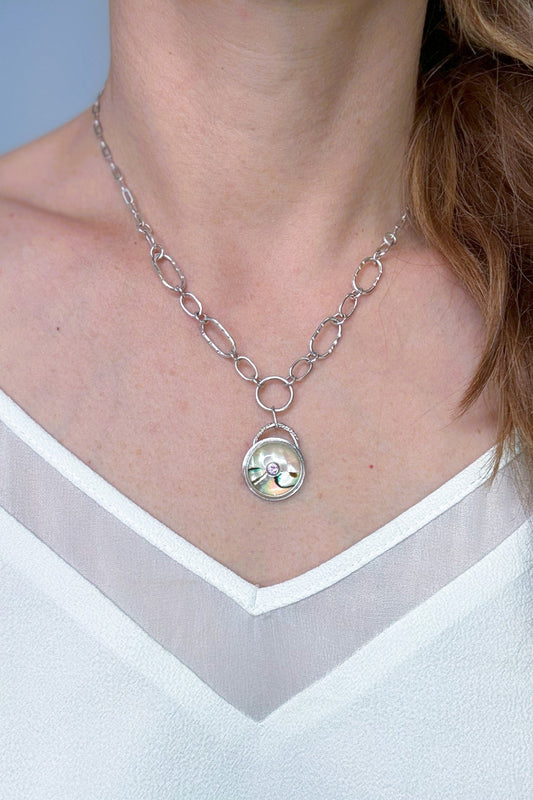 Pink Sapphire and Abalone Sterling Silver Necklace