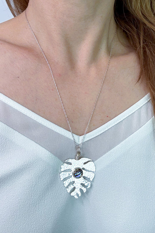 Monstera Leaf + Abalone Hand-Pierced Sterling Silver Necklace