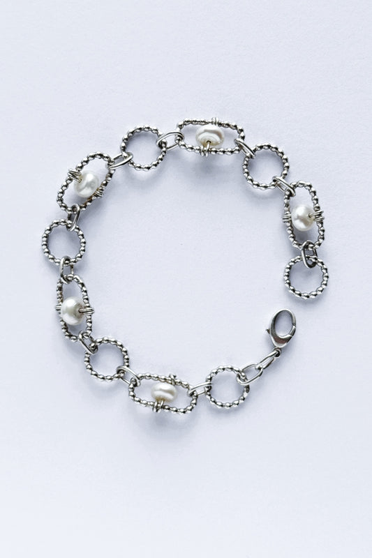 Beaded Oval and Circle Links with Pearls | Sterling Silver Bracelet