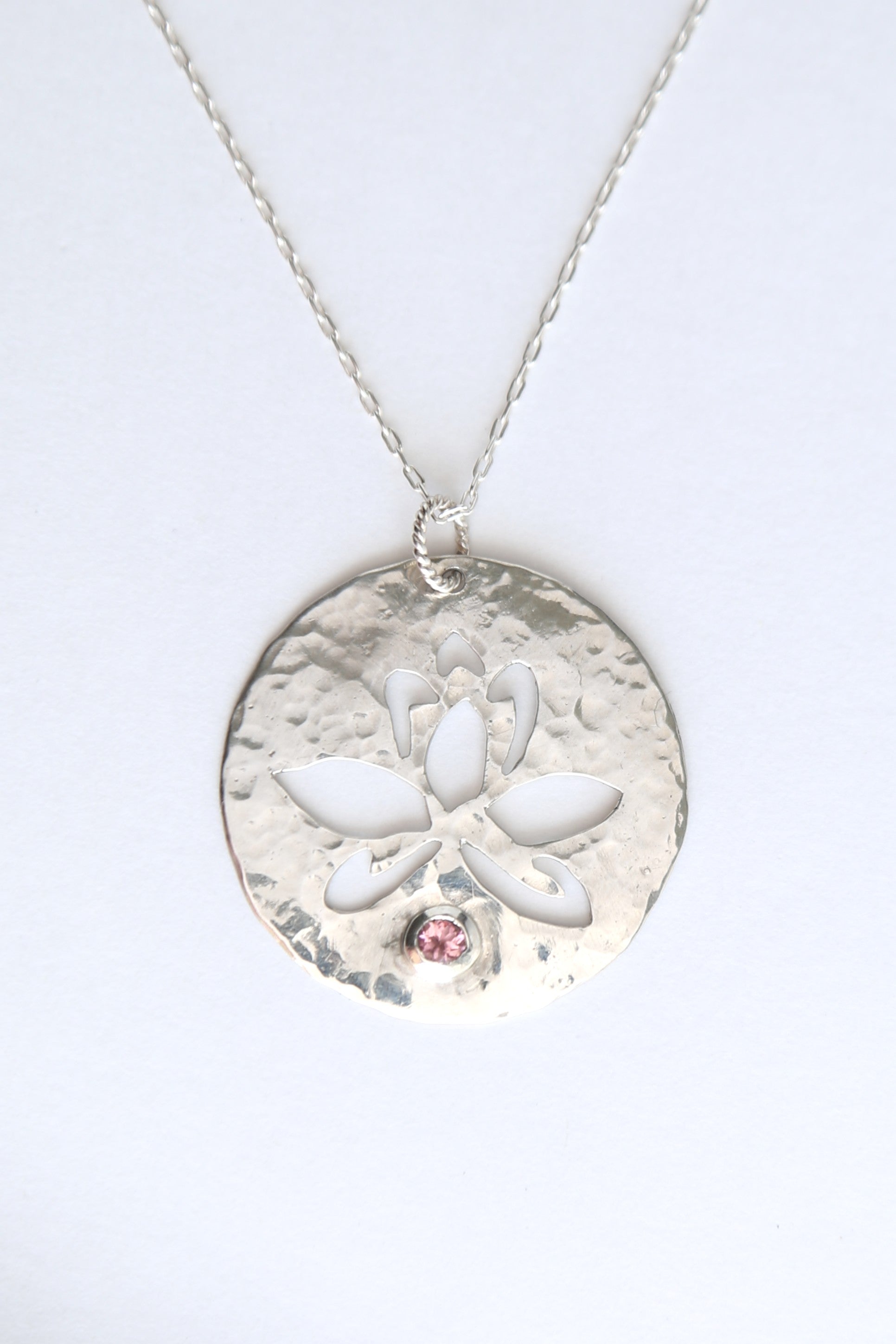 As a flower that is able to rise and bloom above muddy waters, the lotus reflects the human spirit's capacity to overcome challenges and hardships. Embrace your inner strength and new beginnings in your life with this hand-pierced and hand-hammered sterling silver lotus flower pendant that features a faceted and sparkling pink tourmaline gemstone.