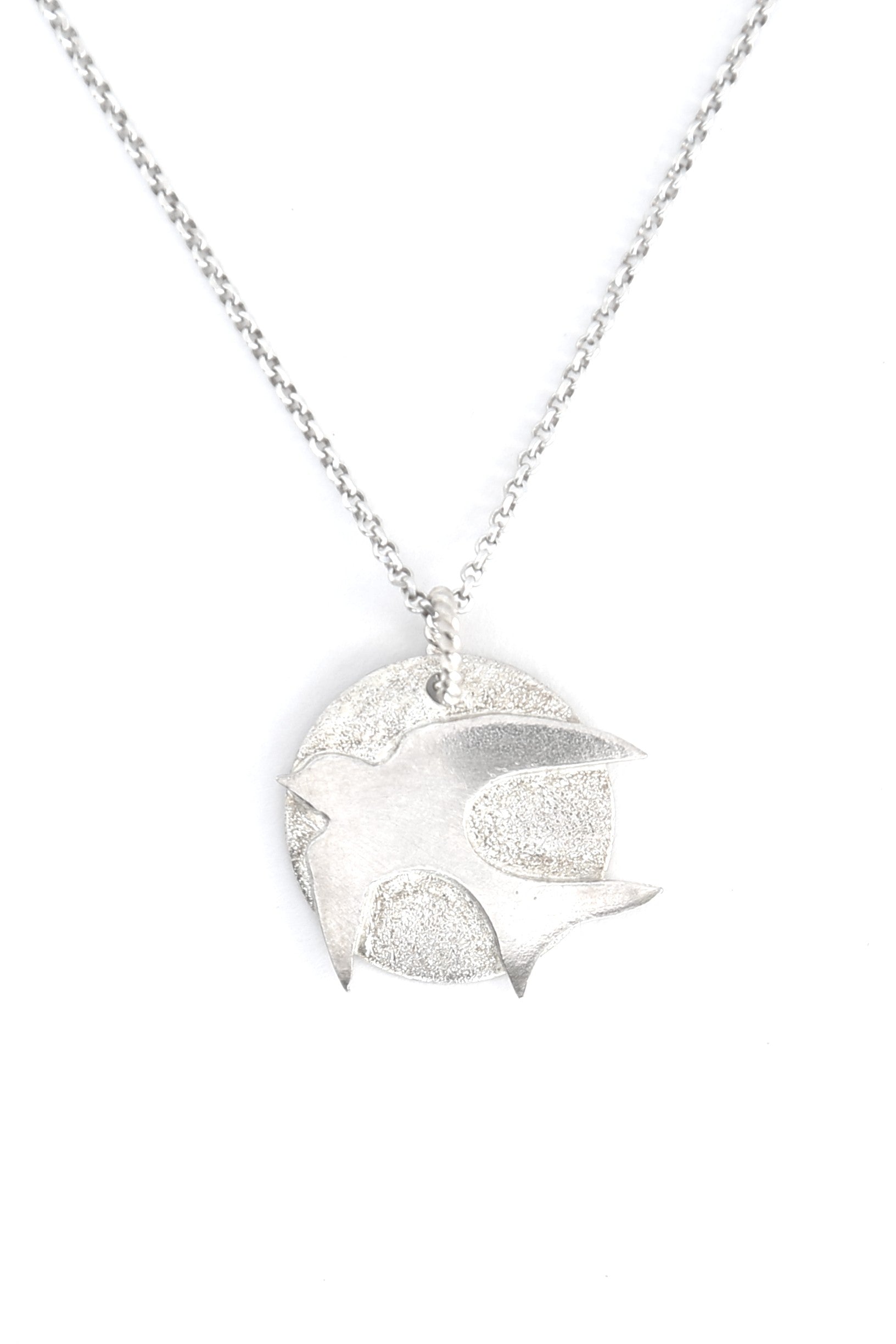 Let your heart take flight with this handcrafted pendant that features a hand-pierced sterling silver swallow crossing a finely texturized sun outline.